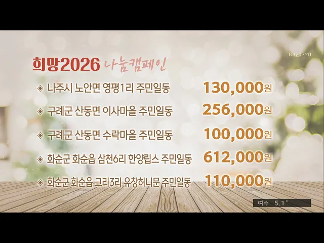 '희망 2026 나눔 캠페인'에 성금을 보내주신 분들입니다.'구례군 산동면 원촌마을 주민일동 1,000,000나주시 반남면 흥덕1리 주민일동 350,000나주시 공산면 금곡5리 주민일동 330,000장성군 진원면 진원1리 고산마을 주민일동 300,000장성군 진원면 상림1리 상림마을 주민일동 150,000화순한국아델리움 입주민 일동 300,00...