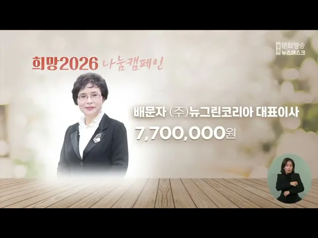 다음은 '희망 2026 나눔 캠페인' 에 성금을 보내주신 분들입니다.이상철 (주)화인데코 대표이사100,000,000원을 보내주셨고최윤수 (주)동양에코 대표이사20,000,000원을 보내주셨습니다.어려운 이웃을 도와주셔서 감사합니다.