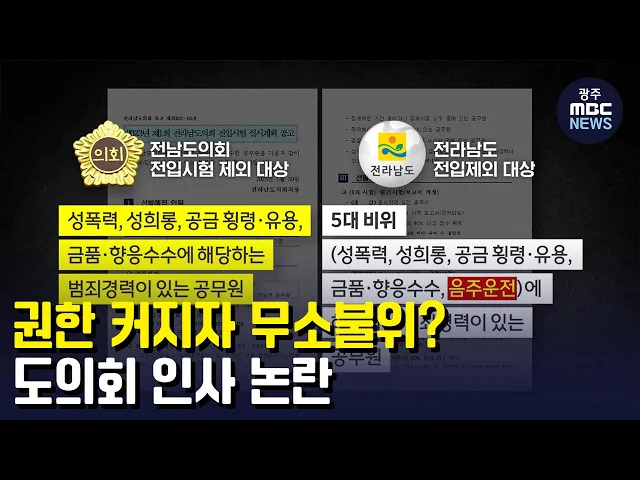 (앵커) 전남도의회가 공무원 전입시험을 실시하면서 '음주운전' 경력을 사실상 용인해 논란이 일었는데요 파장이 커지자 전남도의회는 앞으로 전입시험을 실시하지 않겠다는 황당한 해결책을 내놨습니다. 김진선 기자가 보도합니다. (기자)지난달 전남도의회 홈페이지에 공고된 전입시험 실시계획. 전남도 본청을 제외하고 ...