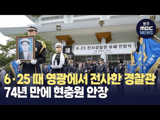 6.25 전쟁에서 전사한 경찰관의 유해가 순국 74년만에 현충원에 잠들었습니다. 경찰청은 어제(27) 국립 대전현충원에서 6.25 전사자 유해발굴사업을 통해 뒤늦게 신원이 확인된 고 김명손 경사에 대한유해 안장식을 거행했습니다. 6.25 전쟁 당시 전남경찰국 소속 2백명의 경찰관이 참여한 영광 삼학리 전투에서 전사한 ...