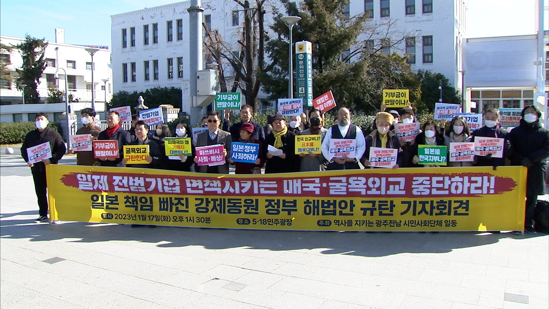 양금덕 할머니와 광주 강제동원 피해자 단체가 정부의 해법안에 반발하고 있습니다. 양금덕 할머니와 일제 강제동원 시민모임은 오늘(17) 오후 광주에서 기자회견을 열고 일본이 빠진 정부의 '제3자 변제' 방안을 받아들일 수 없다며 정부는 저자세 굴종 외교를 멈추라고 촉구했습니다. 이에 앞서 학벌없는 사회를 위한 시...
