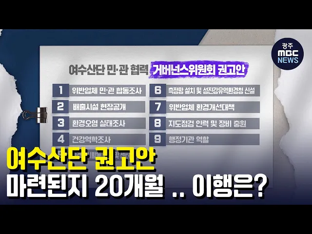(앵커) 3년 전, 여수산단 기업들의 대기오염물질 측정값 조작 사건 이후 거버넌스가 구성됐습니다. 이 거버넌스에선 9가지 환경 관리 종합 대책이 마련됐는데요. 대책이 마련된 지 20개월이 지났지만 기업들의 약속 이행이 지지부진합니다. 김단비 기자입니다. (기자)여수산단 거버넌스가 확정한 권고안에는 위반업체 민관 ...