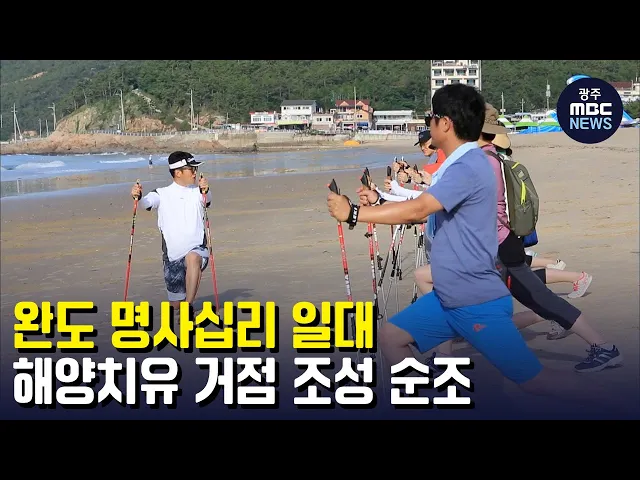 (앵커) 완도 명사십리 일대가 '해양치유산업'의 거점으로 변하고 있습니다. 다양한 해양치유 관련 시설 공사가 본격화 되면서 해양치유산업 생태계 구축이 시작됐습니다. 신광하 기자가 보도합니다.(기자)해양치유 거점으로 육성되고 있는 완도 명사십리 해수욕장에서 열리는 노르딕 워킹 강좌입니다. 완도군이 진행하는 해...