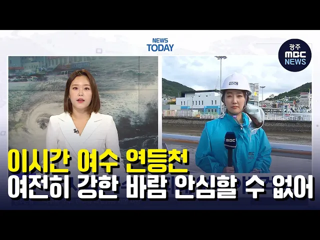 (앵커) 여수 연등천 앞에 취재기자 나가있습니다. 강서영 기자, 지금 여수 상황 어떻습니까? (기자)네, 2시간 전까지만 해도 비가 쏟아지듯 내렸는데 지금은 언제 그랬냐는 듯 비가 거의 그쳤습니다. 하지만 바람은 여전히 강하게 불고 있어 마냥 안심할 수만은 없는 상황입니다. 제가 지금 있는 연등천 인근에는 2천3년 태...