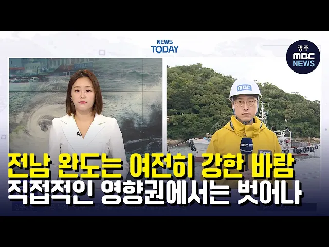 (앵커) 전남 서남해안은 태풍의 직접적인 영향권에서 벗어났지만 여전히 강한 바람이 불고 있다고 합니다. 취재 기자가 나가 있는 완도 연결해 보겠습니다. 박종호 기자 아직도 바람이 강한것 같은데요? (기자) 네. 저는 지금 완도항 제1부두에 나와 있는데요 전남 서남해안은 태풍 영향권에서 벗어나고 있지만 완도 등 일...