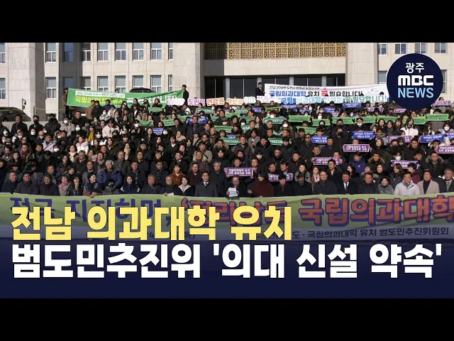 전라남도 국립의과대학 유치 범도민추진위원회는 윤석열 대통령의 '전남 국립의과대학 신설 추진'입장과 관련해 환영의 뜻을 밝혔습니다. 허정 공동위원장은 입장문을 통해 30년 염원의 전남 의대 신설 의지에 화답해 준 대통령에게 감사하다면서 의과대 설립을 뒷받침하겠다고 강조했습니다.또, 전라남도와 목포대, 순천대...