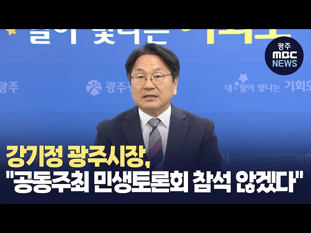 윤석열 대통령이 참석하는 민생토론회와 관련해 강기정 광주시장이 광주전남공동개최를 반대하며단독개최가 아니면 참석하지 않겠다는입장을 밝혔습니다.강 시장은 오늘(11일) 기자간담회에서"대통령실이 민생토론회를 지역간 공동개최로 추진한 것은 단 한차례도 없었다"며"이는 형평성에 맞지 않고, 광주시민이 원하지 않...