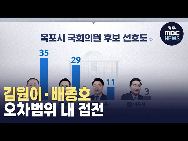 (앵커) 오는 4월 치러지는 제22대 총선을 앞두고 격전지로 분류되는 목포선거구 여론조사를 실시했습니다.국회의원 후보 선호도를 물었더니 김원이, 배종호 후보가 오차범위내 접전을 벌이고 있는 것으로 나타났습니다.김진선 기자가 보도합니다. (기자)목포시민들에게 국회의원에 출마할 후보 가운데누가를 가장 선호하는...