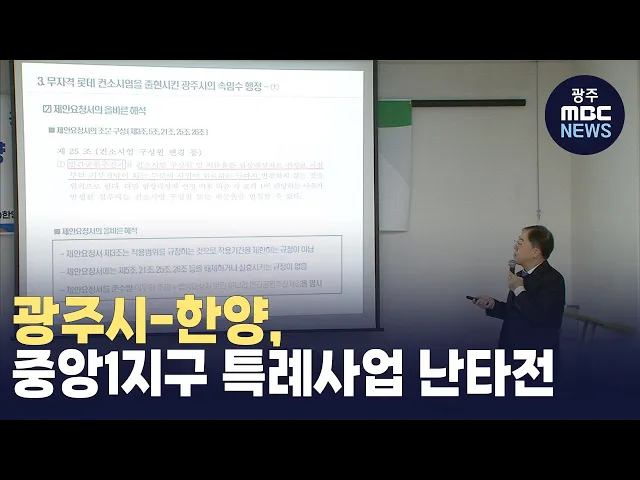 광주 중앙공원 1지구 특례사업의 특수목적법인 소속인 주식회사 한양은 광주시가 자신들의 시공사 지위와 선분양 전환을 위한 사회적 협의체 구성 제안을수용하지 않는다면 법적 조치하겠다고 밝혔습니다.한양은 어제(19) 기자회견을 열고 "민간공원 특례사업이 광주시의 속임수 행정으로 사업자의 이익을 위한 개발사업으...