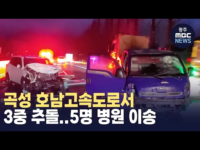 오늘(19) 오전 6시 40분쯤 곡성군 삼기면 호남고속도로 광주 방향 40km 지점에서 차량 3대가 잇따라 부딪혔습니다. 이 사고로 50살 장모 씨 등 5명이 크고 작은 부상을 입어 병원으로 이송됐고, 3시간 가까이 사고 수습이 이어지면서 고속도로가 꽉 막혔습니다. 경찰은 앞서가던 차량이 빗길에 미끌어지면서 뒤따라오던 차...