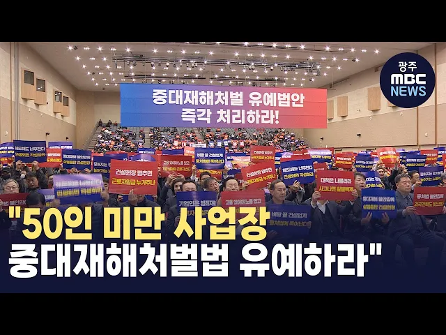 전국 중소기업인들이50인 미만 사업장의 중대재해처벌법 유예를촉구하는 결의대회를 갖습니다.오늘 오후 김대중 컨벤션센터에서 열리는 결의대회에는 호남을 비롯해 전국에서 모인 5천 여 명의 중소기업인들이오는 29일 열리는 국회 본회의에서50인 미만 사업장에 대해서는중대재해처벌법을 유예해달라고 촉구할 예정입니다...