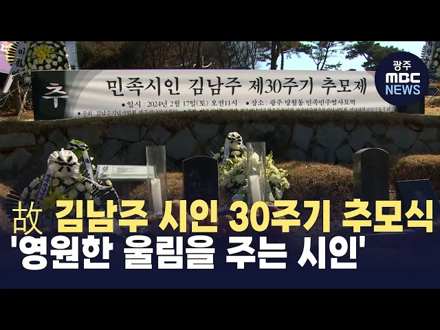 (앵커) 민족 시인이라 불리는 고 김남주 시인의 30주년 추모식이 오늘(17) 열렸습니다.공식적인 추모식은 올해를 끝으로마무리될 것으로 보이는데요.그의 육성 시 낭독은 추모객들에게 여전히 울림을 주었고, 그의 정신은 후대에도 시사하는 바가 큽니다.김초롱 기자의 보도입니다. (기자)* 고 김남주 시인 생전 육성“해방...