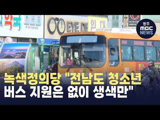 녹색정의당 전남도당은 전라남도가 청소년 100원 버스가 도내 14개 시군으로 확대됐다고 발표한 것과 관련해 "전라남도가 실질적 지원 없이 생색만 내고 있다"고 비판했습니다.녹색정의당 전남도당은 현재 전남 14개 시군에서 시행중인 청소년 100원 버스의 재정은 전적으로 시군에서 부담하고 있다며"전라남도는 생색만 낼...