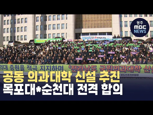 (앵커)목포대학교와 순천대학교가 전남에 공동 의과대학 신설 추진에 전격 합의했습니다. 이런가운데 국회 앞에서는 정부에 전남권 의대 신설을 촉구하는 범도민 결의대회가 열렸습니다. 안준호 기자가 취재했습니다. (기자)목포대학교와 순천대학교는 그동안 자신들의 대학에 의대가 신설되어야 한다며 경쟁해 왔습니다....