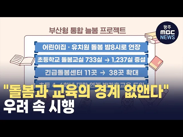(앵커)부산에서는 부산시와 교육청, 지역대학이 함께 하는 통합형 돌봄*교육 프로젝트가 오는 3월 추진됩니다.하지만 학교의 돌봄 확대가 교육적으로 맞지 않다는 우려와 함께업무 가중에 대한 반발도 적지 않습니다.부산문화방송 남휘력 기자가 전해드립니다.(기자)영유아 어린이집과 유치원은 물론 초등학교를 아우르는 ...