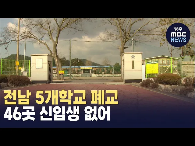전남 지역에서 폐교하는 학교가 5곳에 달하고 46개 학교가 올해 신입생을 받지 못했습니다.전남교육청은 학생수 감소로 폐교하는 학교가강진 북초등학교와 순천 승주초 북학분교, 여수 소라초 신흥분교 등 5곳이라고 밝혔습니다.또 올해 초등학교 예비소집을 마친 결과 입학 예정학생이 없는 학교가 분교장 29곳을 포함해 ...