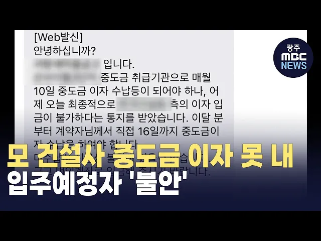 지역의 모 건설사가 은행에 중도금 이자를 내지 못하면서 예비 입주자들의 불안감이 커지고 있습니다. 해당 건설사가 광주 동구에 짓고 있는 아파트 등을 분양받은 입주 예정자들은 최근 건설사가 계약과 달리중도금 이자를 내지 못해 은행으로부터 이자를 대신 내라는 문자를 받은 것으로 확인됐습니다. 건설사 측은 수분...
