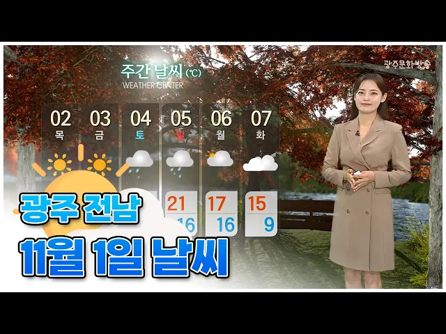 11월의 시작인 오늘 출근길 날씨는 다소 흐릴 수 있겠습니다.가끔 구름 많은 날씨 예상되는 가운데 오전까지 광주와 전남 서부에는 약한 빗방울이 떨어질 수 있겠고요.안개도 짙게 끼겠습니다.안전운전 하시기 바랍니다.오늘 바람도 다소 강하게 불것으로 보여서아침저녁으로는 더 춥게 느껴지겠습니다.순간풍속 55km/h의 ...
