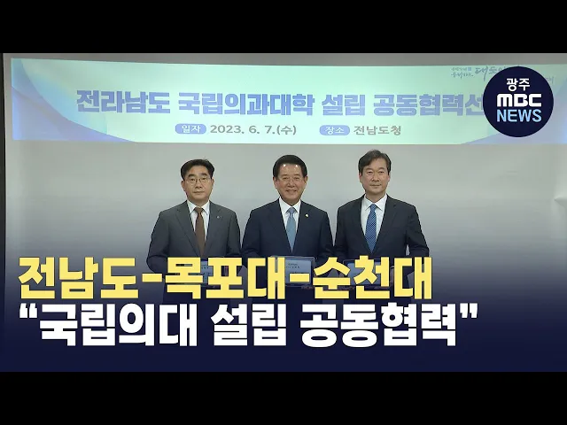 전라남도와 목포대, 순천대가 전남 국립 의과대학 설립에 공동협력하기로 선언했습니다. 김영록 전남지사와 송하철 목포대 총장, 이병운 순천대 총장은 오늘 전남도청에서 협약식을 갖고 의대 설립을 위한 양 대학 간 역량집중과 상호협력 강화, 의대 정원 확대 논의에 의대 신설을 반드시 포함하도록 촉구하는 내용을 담아...