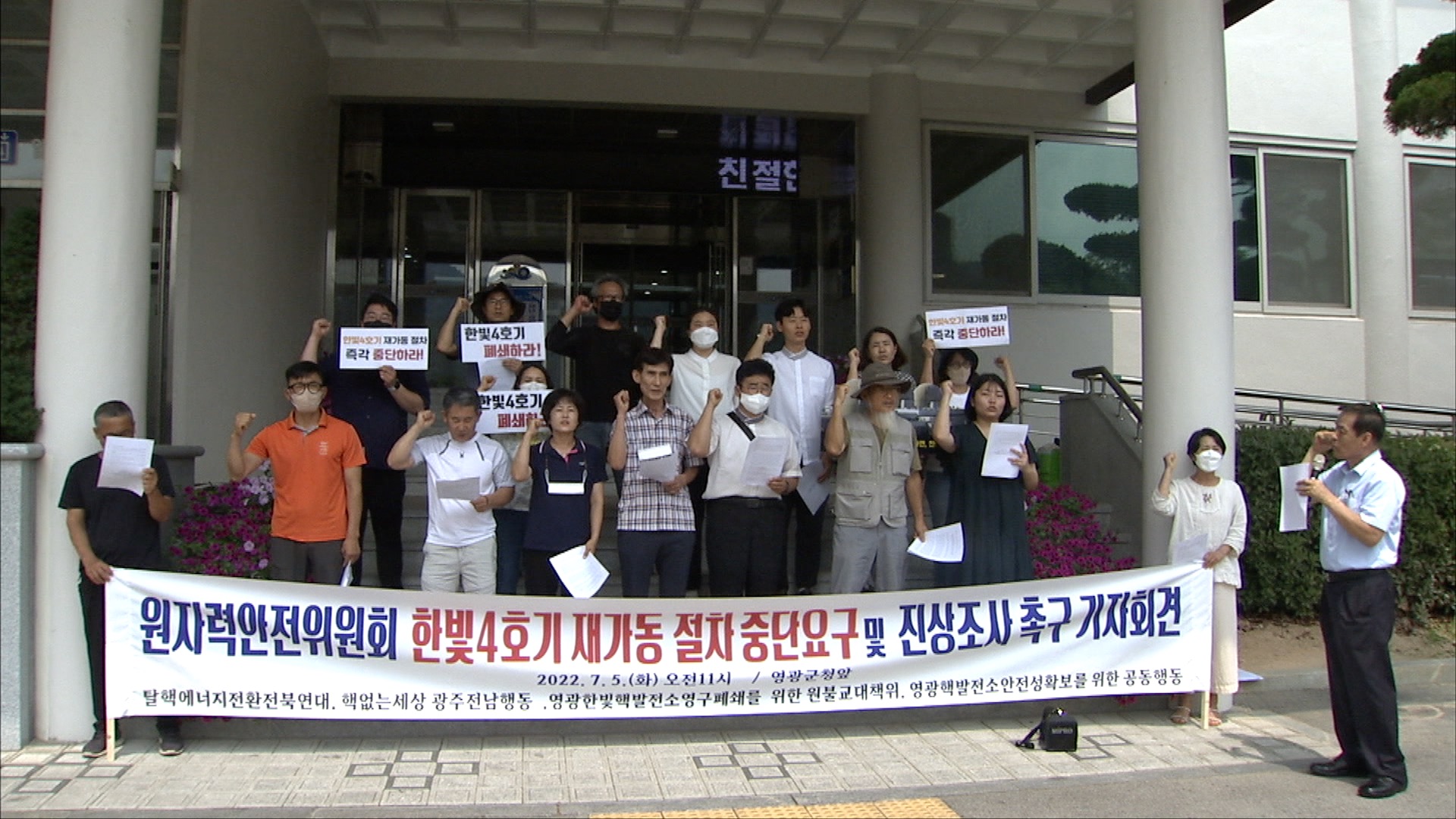 한빛원전 4호기가 구조건전성 평가 결과 문제가 없다는 결론에 따라 재가동 절차를 앞두고 있다는 광주MBC 보도 이후 시민사회 단체가 추가 조사를 촉구했습니다. 영광핵발전소 안전성 확보를 위한 공동행동 등 시민단체는 오늘(5) 영광군청에서 집회를 열고 추가 조사 없이 상부돔 공극이 없을 것이라 추정한 상태로 한빛 ...