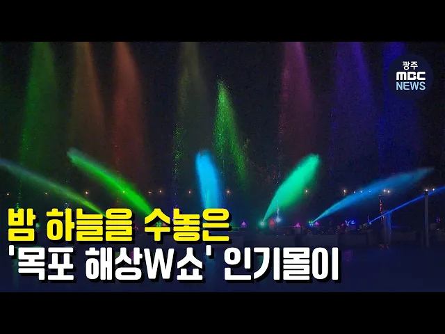 (앵커) 사회적 거리두기 해제 이후 전국 유명 관광지에 관광객들이 몰리고 있는데요. 맛의 도시로 유명한 목포에서는 주말마다 화려한 불꽃과 바다분수 공연이 어우러지는 해상W쇼가 열려 인기를 끌고 있습니다. 박종호 기자가 보도합니다.(기자) 형형색색의 불꽃이 밤하늘을 수놓습니다. 바다 위에서는 음악에 맞춰 바다분...