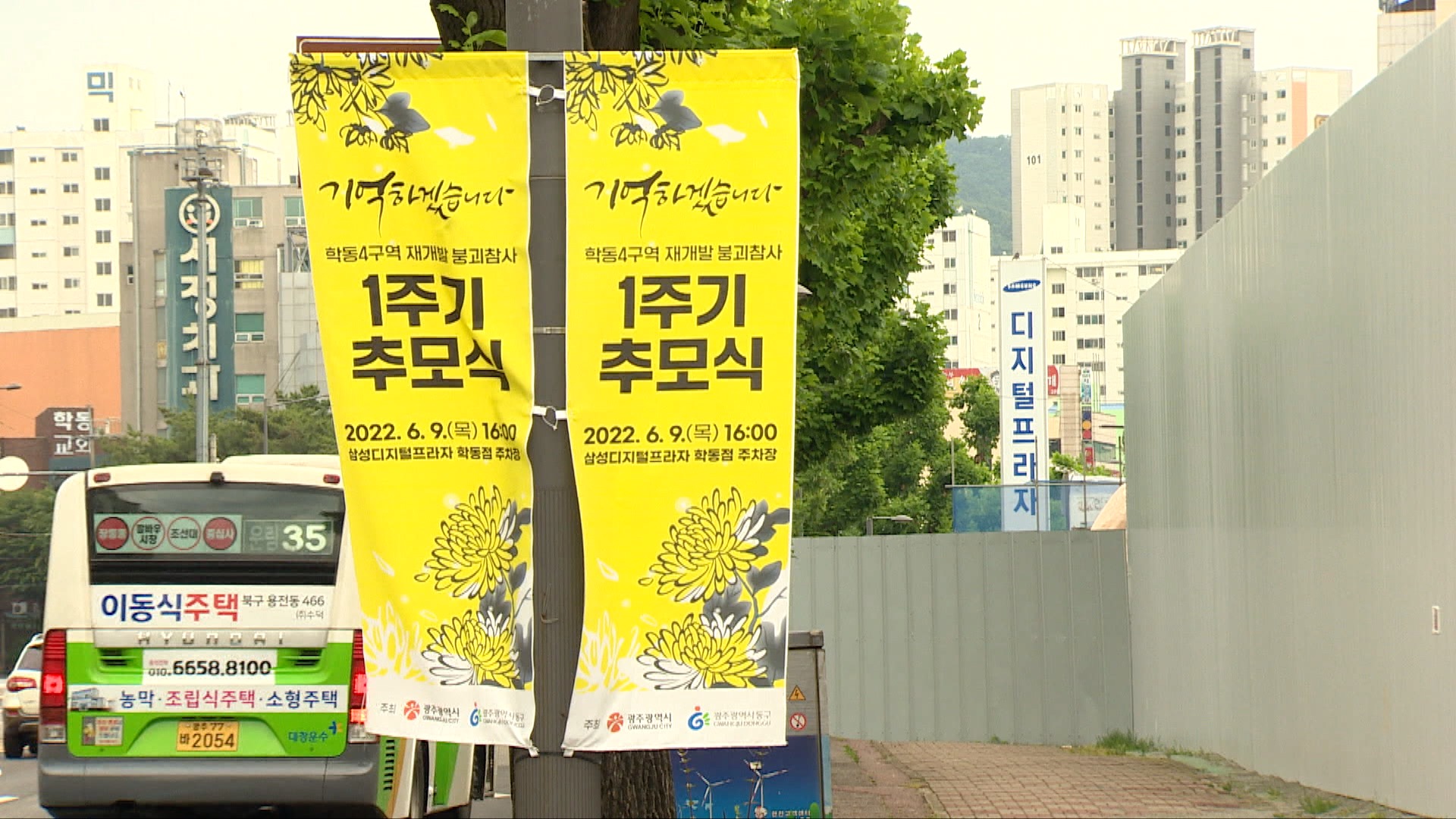 (앵커) 1년 전 대낮에 철거 건물이 무너져 버스에 타고 있던 아홉명의 시민들이 끝내 돌아오지 못했습니다. 광주에선 학동 참사를 잊지 않겠다는 추모식이 열렸는데요. 단순 행사뿐이 아니라 그들의 희생이 남긴 문제들을 온전히 기억하고 있는지 살펴봤습니다. 우종훈, 임지은 기자가 이어서 보도합니다. (기자)철거가 한...