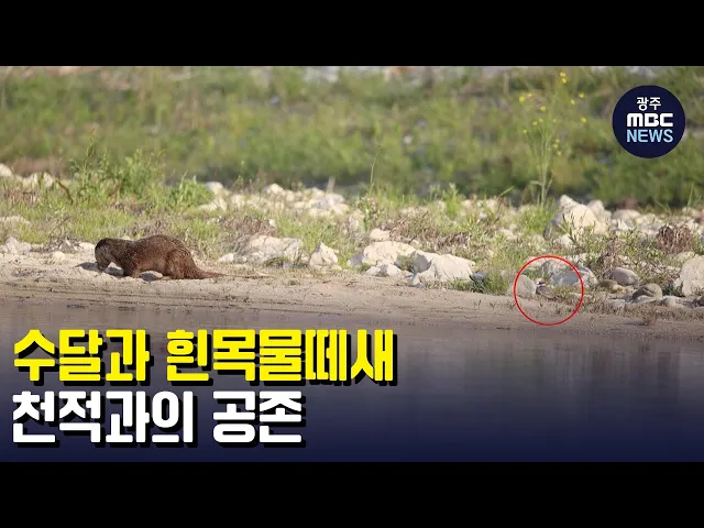 (앵커) 수달은 새들이 낳아 놓은 알 뿐 아니라, 새도 잡아 먹는 식욕을 자랑하는데요, 멸종위기 야생동물인 흰목물떼새와 함께 생활하는 이례적인 모습이 카메라에 포착됐습니다. 부정석 기잡니다.(기자)하천에서 먹이를 잡던 수달이 모래사장으로 천천히 올라옵니다. 모래가 마른 적당한 곳을 찾자 몸을 흔들며 물기를 털...