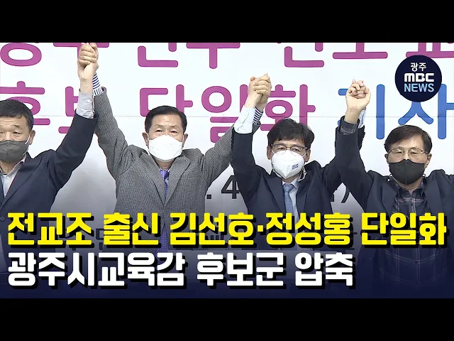 (앵커) 그동안 6파전으로 진행돼왔던 광주시교육감 선거에 지각 변동이 일어났습니다. 전교조 출신인 김선호, 정성홍 두 예비후보가 단일화를 발표한 건데요. 이번 단일화에 따라 향후 판세가 어떻게 달라질지 주목됩니다. 보도에 이다현 기자입니다. (기자) 광주시교육감 선거에 출사표를 던진 김선호, 정성홍 예비후보가 ...