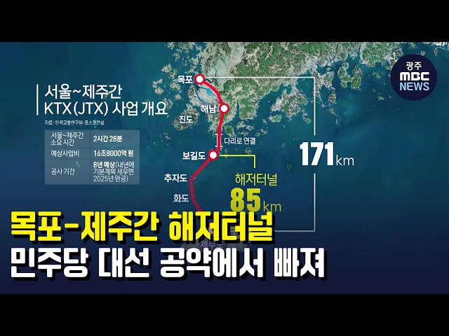 (앵커) 오랜 숙원인 목포와 제주간 해저터널 건설 계획이 기대했던 민주당 대선 공약에서 빠졌습니다. 제주도민의 반발로 이전 대선에서도 3번이나 무산됐는데도 여당인 민주당이 그냥 단골 메뉴로 던졌다는 빈축을 사고 있습니다. 문연철 기자가 취재했습니다.(기자) 그동안 잠잠했던 제주 해저터널 논란에 불씨를 댕긴 것...