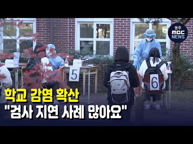 (앵커)수능을 앞두고 코로나19에 대비하고 있지만 학교를 통한 집단감염이 계속 이어지고 있습니다.특히 증상이 나타난 감염자가 검사를 받기까지 사흘 이상 지연되는 사례가 빈번해 우려의 목소리가 높습니다.조현성 기자의 보돕니다.(기자)이미 확진자 14명이 나온 중학교와 인접한, 광주 광산구의 또 다른 중학굡니다.이...