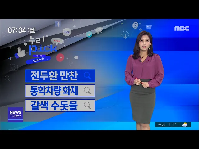 (뉴스리포터) 한 주간 누리꾼들의 관심사를 키워드로 정리해보는 '누리 픽' 시간입니다. 지난 한 주, 어떤 키워드가 많은 관심을 받았을까요? ' 전두환 만찬 ' ' 통학차량 화재 ' ' 갈색 수돗물 ' 이 있었습니다. 어떤 내용인지, 먼저 ' 샥스핀 만찬 ' 부터 살펴보겠습니다~ ============================================ ...