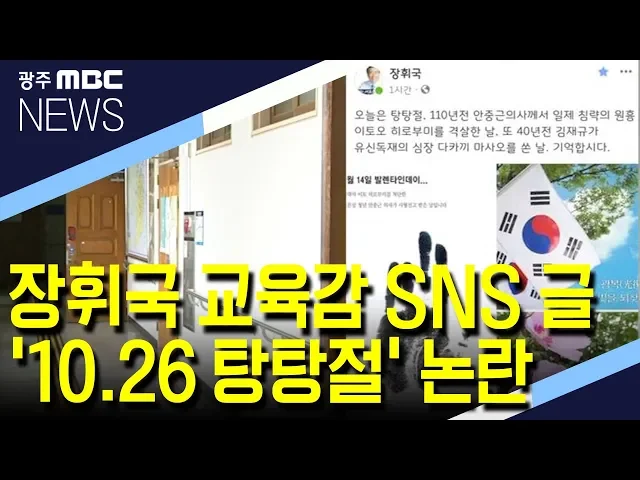 장휘국 광주시교육감이 10.26을 '탕탕절'이라고 표현해 논란이 일고 있습니다. 장 교육감은 지난 26일 자신의 페이스북에 안중근 의사가 이토 히로부미를 격살하고, 김재규가 '다카키 마사오'를 쏜 날인 오늘은 탕탕절이라며 기억하자는 글을 올렸습니다. 이에대해 자유한국당은 논평을 통해 박정희 전 대통령의 서거일을 ...