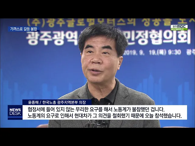 (앵커) 광주형 일자리 사업은 노사민정의 대타협을 기본 전제로 하고 있습니다. 그러다보니 협의 과정이 순탄하지만은 않습니다. 노사정의 갈등으로 하마터면 합작법인 설립이 무산될 수 있는 최악의 상황까지 우려됐지만 다행히 한 고비를 또 넘겼습니다. 보도에 송정근 기자입니다. (기자) 광주형 일자리 자동차공장 합작...