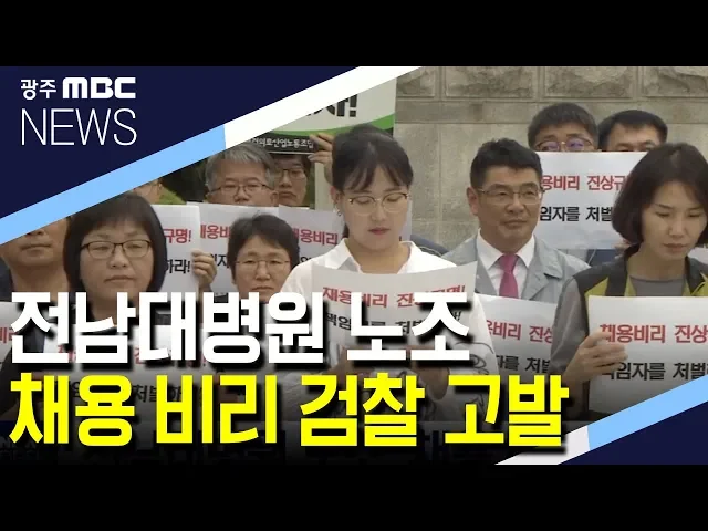 전남대병원 노조가 지난해 병원 채용비리가 있었다며 관계자들을 검찰에 고발했습니다. 보건의료노조 전남대병원지부는 오늘(6) 광주지검 앞에서 기자회견을 갖고 지난해 병원의 한 관리자가 조카의 서류*면접에 심사위원으로 참여해 100점을 주는 등 부적절한 행위가 적발됐는데도 병원이 솜방망이 징계에 그쳤다고 주장했...