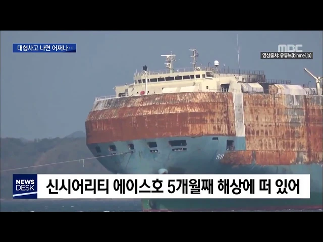 ◀ANC▶ 일본 자동차를 싣고 운항하다 하와이 인근 해상에서 불이 난 대형 화물선이 다섯 달째 바다를 떠돌고 있습니다. 지금은 진도 해상에 떠 있는데 배는 기울어지고 예인선마저 기름이 떨어져 해상 사고 위험이 커지고 있습니다. 무슨 사연인지,김양훈 기자가 취재했습니다. ◀END▶ 전남 진도 만재도 남쪽 16km 해상...