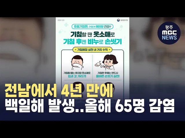 전남에서 4년 만에 백일해가 발생한 가운데올해 현재까지 백일해에 감염된 도민은 65명으로 집계됐습니다.연령별로는 10대가 55명, 84%로 가장 많았고0~9세와 70세 이상에서 각각 3명씩 발생했습니다.백일해는 보르데텔라균에 의해 발생하는제2급 법정감염병으로 콧물과 기침 등 가벼운 증상으로 시작해 심할 경우 구토와 ...