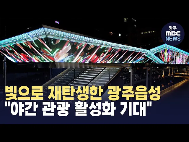 (앵커) 광주에 또 하나의 볼거리가 생겼습니다.일제강점기에 없어진 광주읍성을 미디어아트로 복원한 '빛의 읍성'이광주 시민들에게 선을 보였습니다.도심 야간 관광 활성화에도움이 될 것으로 보입니다.송정근 기자입니다.(기자) 화려한 조명이 불을 밝히고 있는 한 조형물.다양한 영상이 조형물에 설치된 대형 스크린으로...