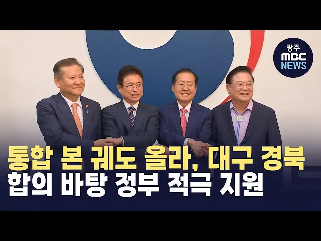 (앵커) 대구와 경북의 통합 추진을 위한 4자 회동이 처음으로 열렸습니다.대구 경북의 합의를 바탕으로 정부는 적극 나서서 지원 방안을 마련하겠다고 뜻을 모았습니다.2026년 7월 통합자치단체 출범을 목표로 통합안을 마련하고, 올 연말쯤 통합 특별법 제정을 추진하기로 했습니다.대구문화방송 김철우 기자입니다.(기자)...
