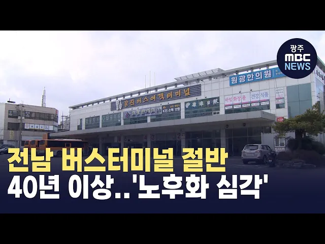 전남도 버스터미널의 절반가량이 지어진 지 40년 이상 된 것으로 조사됐습니다.전남 지역에서 운영 중인 버스터미널은 모두 41곳으로,이 중 40년 이상 된 곳은 19곳입니다. 전남도의회는 버스터미널 노후화가 심각하다며,다수의 대중이 이용하는 시설인 만큼 관련 예산을 확보해야 한다고 밝혔습니다. #전남도 #전남 #버스...