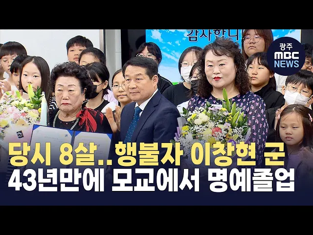 5.18민주화운동 당시 행방불명된 이창현 군이 43년만에 모교에서 명예졸업장을 받았습니다.광주시교육청은 5.18 44주기를 하루 앞둔 오늘(17)광주 서구 양동초에서 5.18 행방불명자 이 군의명예졸업식을 열었습니다.이 졸업식에는 이 군의 어머니와 누나가 참석해아들의 졸업장을 받았고,학교 관계자와 학생들에게 감사 인...