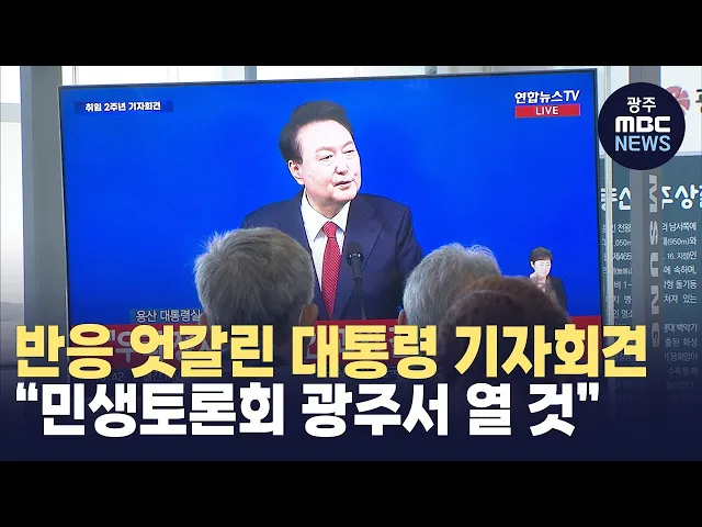 (앵커) 윤석열 대통령이 취임 2주년을 맞아 기자회견을 열었습니다.윤 대통령의 기자회견을 본 지역민들의 반응은 엇갈리고 있습니다.김영창 기자가 보도합니다. (기자)시민들이 윤석열 대통령의 취임 2주년 기자회견을 유심히 지켜보고 있습니다.100분 가까이 진행된 기자회견을 본 지역민들의 반응은 엇갈렸습니다.'국민...