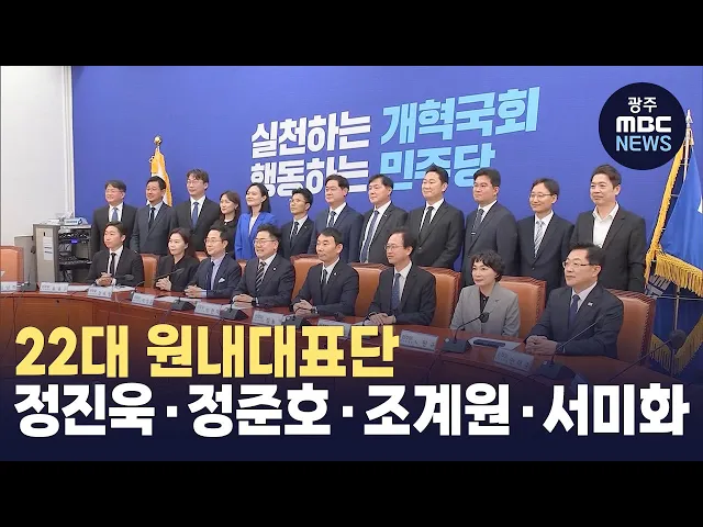 더불어민주당이 22대 국회를 이끌 원내대표단 22명을 발표한 가운데 광주전남에서는 정진욱, 정준호, 조계원, 서미화 당선인이 대표단에 이름을 올렸습니다. 박찬대 더불어민주당 원대대표가 발표한 22명의 원내대표단 가운데 정진욱 당선인이 원내대표 비서실장에 임명됐고 정준호 당선인과 조계원 당선인, 서미화 당선인...