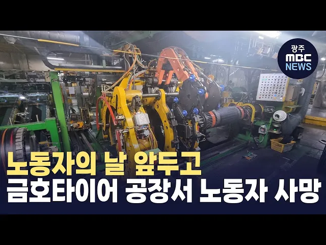 (앵커) 어제(29) 금호타이어 곡성 공장에서 50대 노동자가 타이어 성형기계에 끼어 숨졌습니다. 노동자의 날을 이틀 앞두고 또다시 발생한 사망 사고입니다. 천홍희 기자입니다.(기자)금호타이어 곡성공장에 있는일체형 타이어 성형기계입니다.고무 원자재를 동그란 모양으로 만드는 장치입니다. 노동절을 이틀 앞두고 35...
