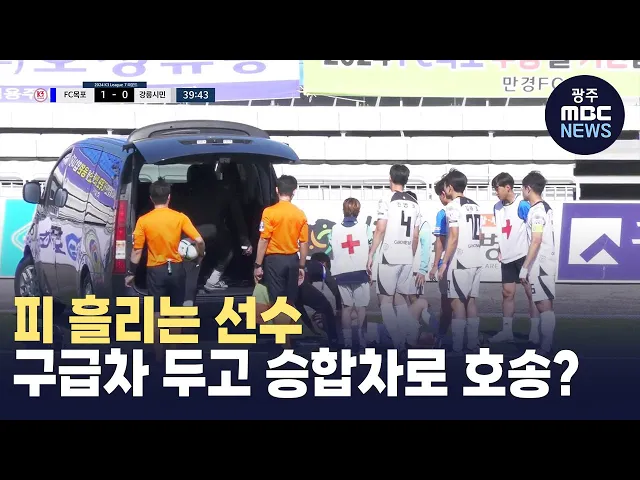 (앵커) 지난 주말 목포에서 목포FC와 강릉시민축구단의K3리그 경기가 펼쳐졌습니다.경기 도중 선수가 부상을 입었는데,규정을 이유로 대기중이던 구급차를 두고일반 차량으로 이송하는 등 절차를 두고 논란이 일고 있습니다. 최다훈 기자가 취재했습니다.(기자)지난 27일 열린 FC목포와 강릉시민축구단의K3리그 7라운드 경...