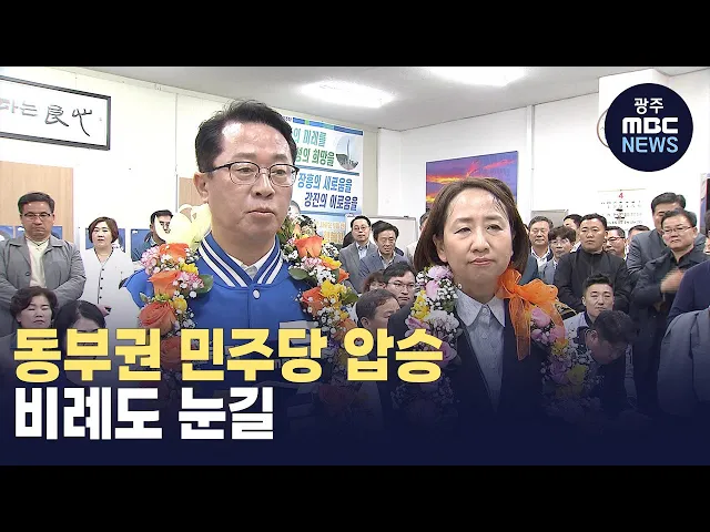 (앵커)전남 동부권 5개 선거구에서도민주당 후보가 모두 당선됐습니다.특히 이번 선거에서지역 출신이거나 활동하는 3명의 후보가 비례대표로 당선돼 눈길을 모았습니다.유민호 기자입니다. (기자)여수갑에서는 민주당 주철현 후보가 득표율 88.9%를 기록하며,전남 동부권 유일한 재선 의원이 됐습니다.맞대결을 펼친 국민...