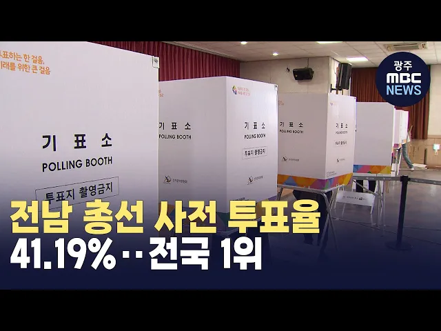 제22대 총선 사전투표 결과 전남의 사전투표율이 41.19%로 전국 1위를 기록하고 역대 총선 중 최고치를 경신했습니다.시군별로 보면,신안군이 54.81%로 가장 높고,곡성 50.51%, 장성 50.04% 등입니다. 사전투표는 지난 5일부터이틀간 전국에서 치러졌으며,전국 평균 투표율은 31.28%로지난 총선보다 4.59%포인트 상승했습니...