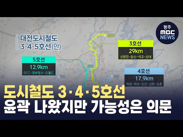 (앵커) 도시철도 2호선을 건설하고 있는 대전광역시가 도시철도 3·4·5호선 구축계획을 발표했습니다. 1호선 지하철, 2호선 트램과 더불어 대전의 동서, 남북을 연결하는 대중교통 체계로 기대를 모으는데요.차량 형식이나 사업비 등이 불투명해실현 가능성에 의문이 제기됩니다.대전문화방송 조형찬 기자가 보도합니다.(기...