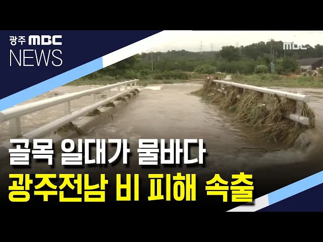 (앵커) 광주와 전남 지역에 지난 밤사이 물폭탄이 쏟아졌습니다. 주택과 농경지가 물에 잠기고, 흙더미가 도로를 덮치는 등 피해가 잇따랐습니다. 이다현 기자입니다. (기자) 광주 북구 중흥동의 한 골목. 성인 무릎 높이까지 흙탕물이 차올랐습니다. (현장음) 밤사이에 광주에 150밀리미터가 넘는 장맛비가 쏟아지면서 골...