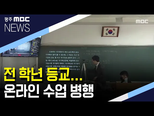 (앵커) 이번 주부터 모든 학교에서 전체 학년이 등교해 수업을 받습니다. 실질적인 개학이 시작되는 셈인데요. 학생수가 많은 학교에서는 여전히 과밀 수업에 대한 우려가 높습니다. 이 때문에 일부 학교에선 등교와 온라인 수업을 함께 진행하기로 했습니다. 이재원 기잡니다. (기자) 광주 수완지구의 한 중학굡니다. 학년...