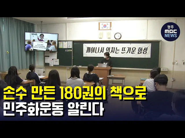 (앵커) 광주의 한 고등학교 학생들이 민주화운동을 주제로 직접 수업 교재를 만들어서 눈길을 끌고 있습니다. 손수 만든 교재로 수업도 진행하고 있는데, 내용을 들은 학생들의 호응도 좋다고 합니다. 이다현 기자입니다.(기자)일일 선생님으로 교단에 선 학생이 상황극을 연출합니다. 외국인에게 영어로 5.18 민주화운동을...